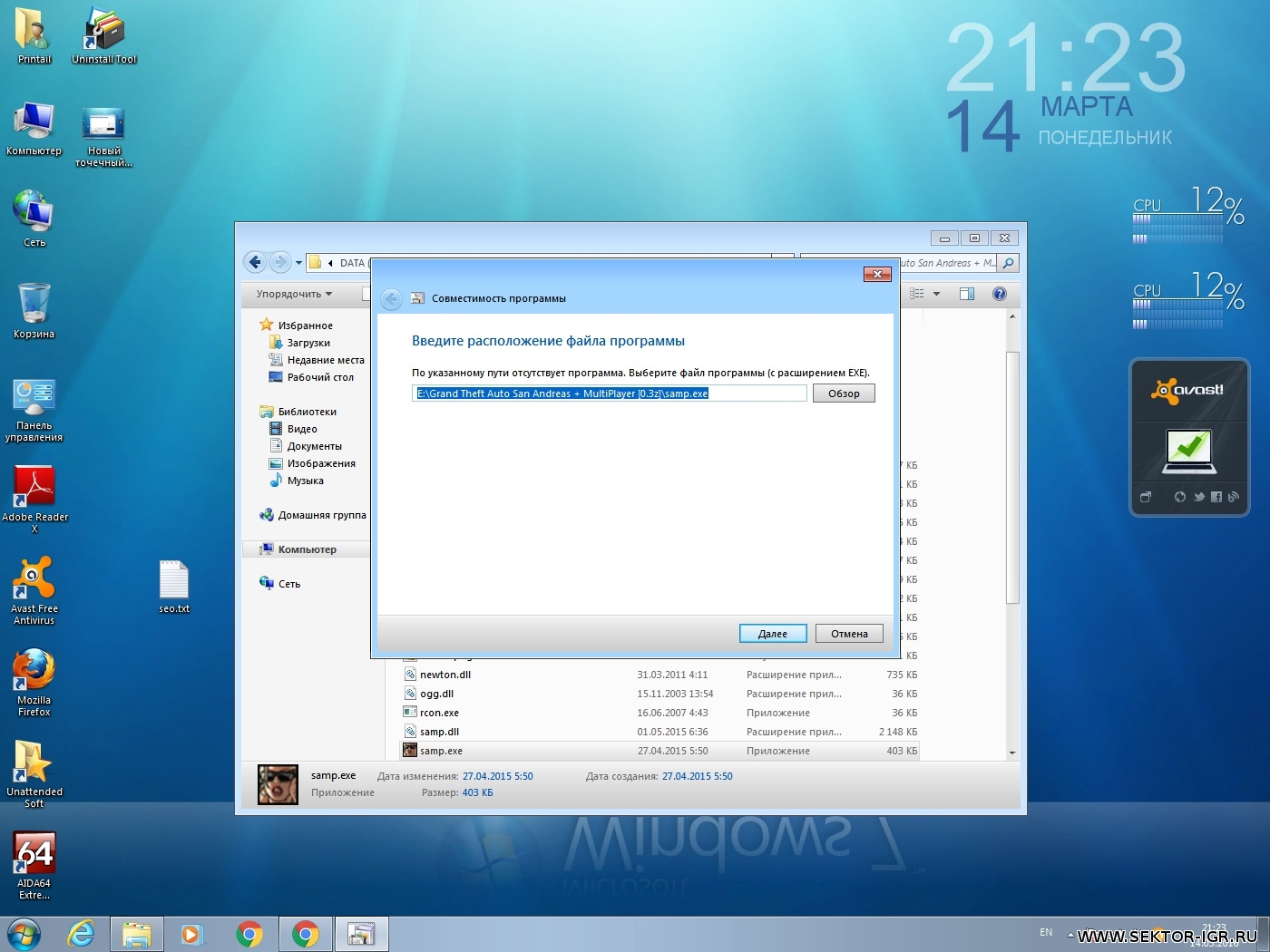 | Внимание знатоки,поставил новый системник,стояла 10 винда,поменял на 7-ку,с старого винта перетащил архив гташки (скачан с сайта) Кароч к сути...нажимаю запустить сервак,ничего не проиходит,и через зелёную стрелку в панели - аналогично,от имени админа и совместимость ставить тоже не прокатило... Если поможет,то тыкаю на samp.exe-пкм-исправление неполадок совместимости. и вылезает следующий текст:Первому кто толком скажет как это исправить - перевожу через банк премию,остальным буду благодарен