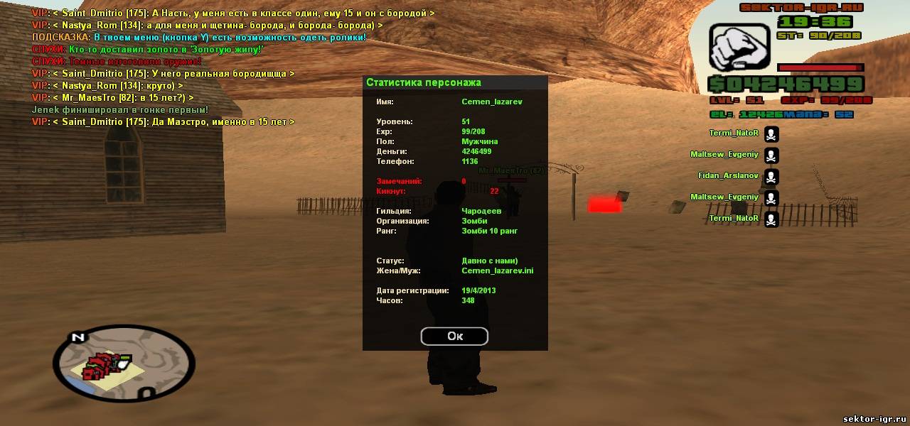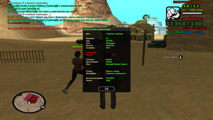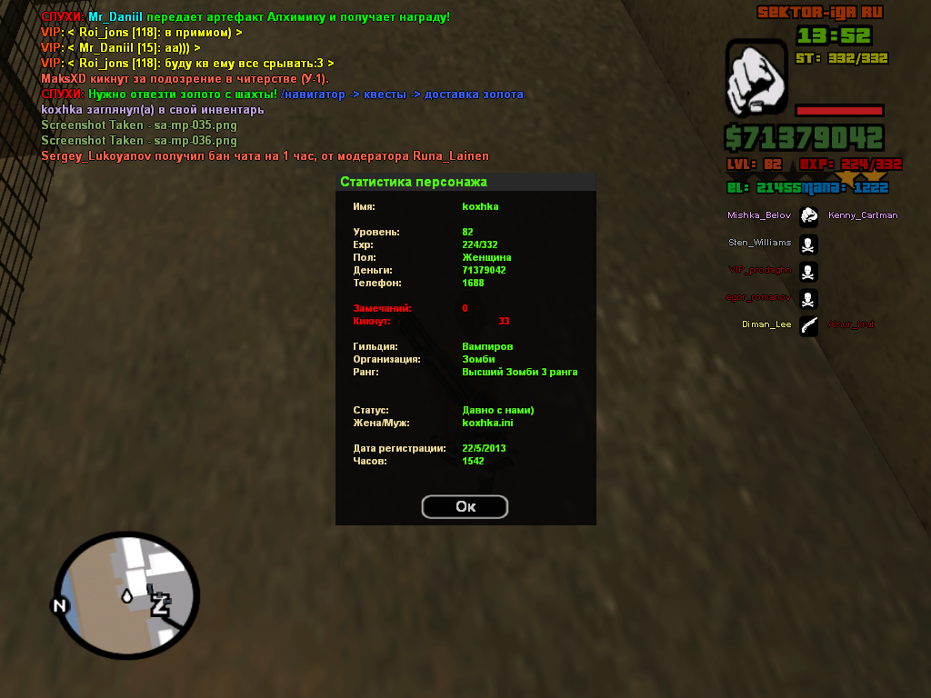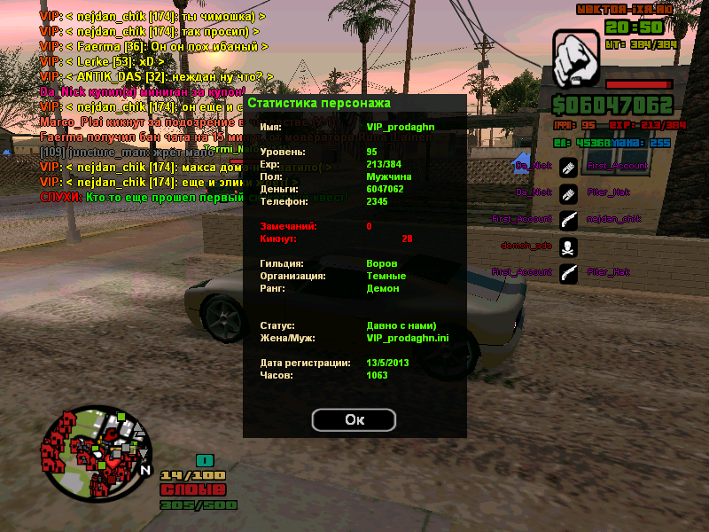 | ник бомбе ,лвл 80,часов-805 file://localhost/C:/Documents%20and%20Settings/Admin/Мои%20документы/GTA%20San%20Andreas%20User%20Files/SAMP/screens/sa-mp-172.pngДобавлено (02.10.2013, 20:31) --------------------------------------------- руна не добовляй плиз дай другим выигарть хоть что-то