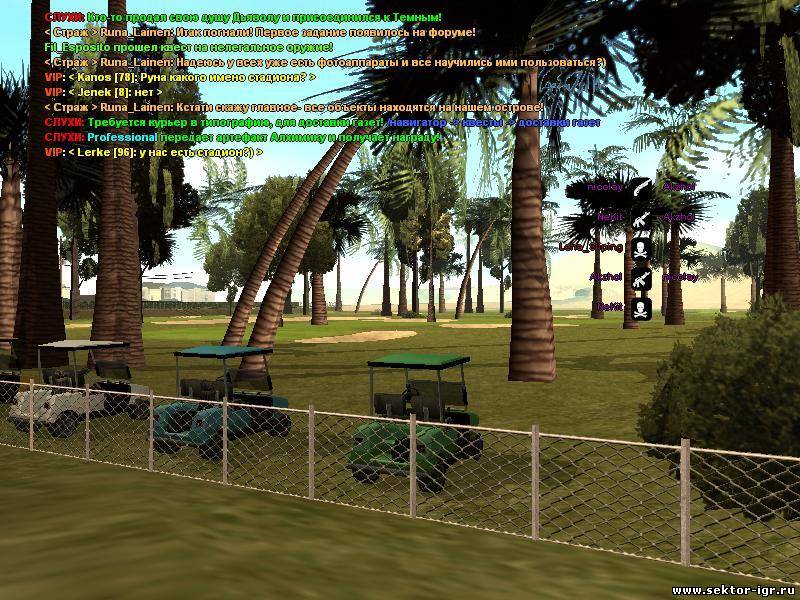 | Цитата Runa (  ) Задание 3РЕДАКТОР: Отлично. Пока у спортсменов перерыв поработаем с объектами ещё. Богатые люди тоже любят спорт и игры. Сделай снимки гольф-клуба, чтобы машинки были клюшки, ну сам знаешь. Этот гольф-клуб принадлежит одному влиятельному человеку, поговори с ним, сделаем статью об этом. (Сделайте скрин машинок для гольфа)
