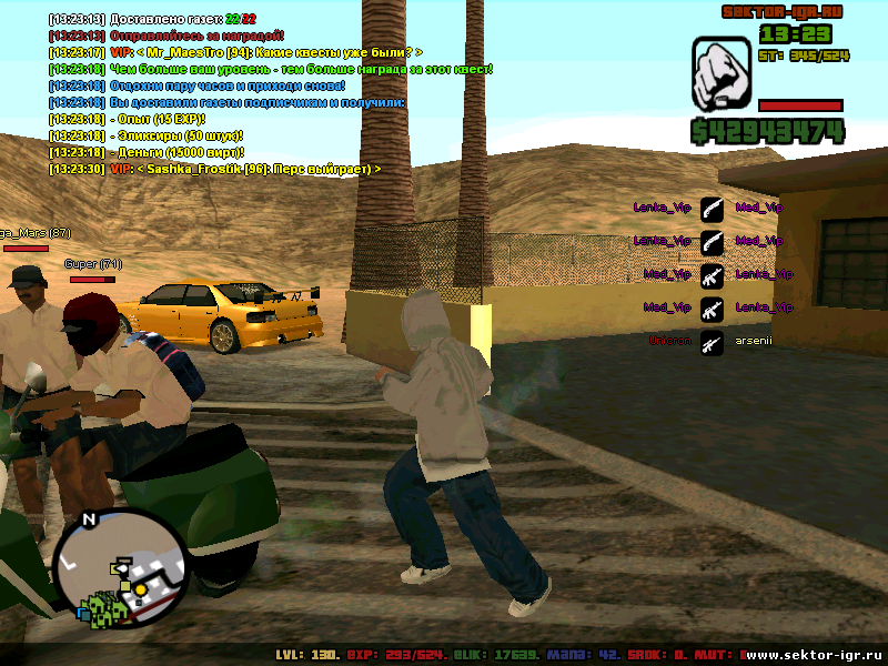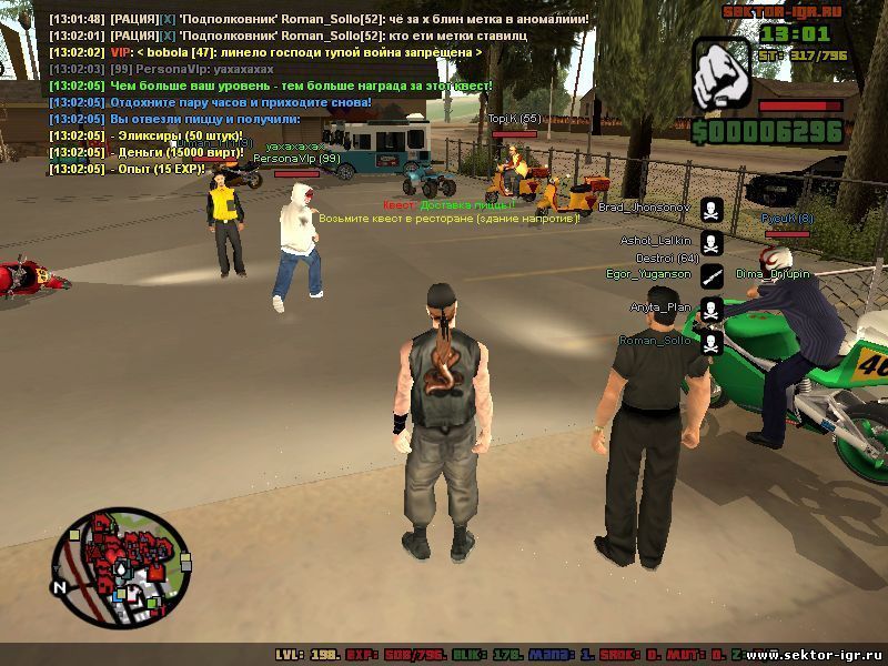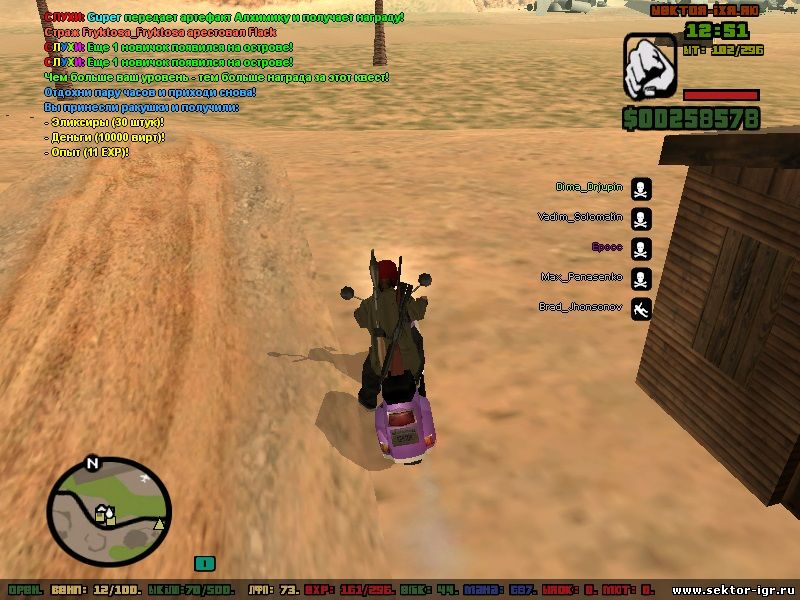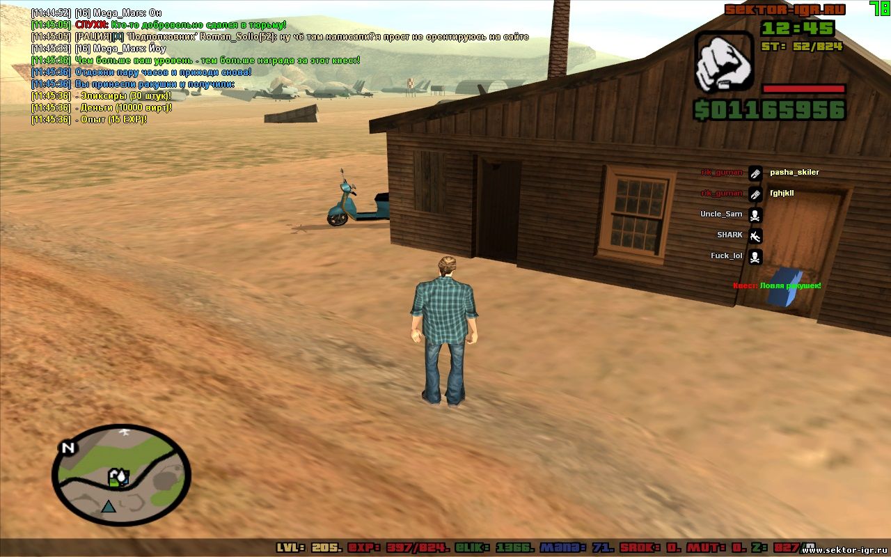 - Сделать скришот в игре можно нажав на клавишу F8, картинка сохранится в папку С - Мои документы - GTA San Andreas User Files - SAMP