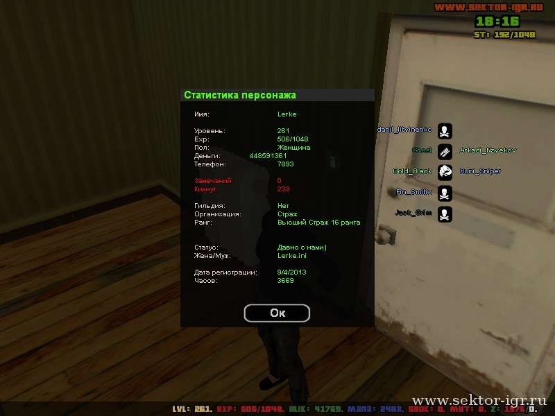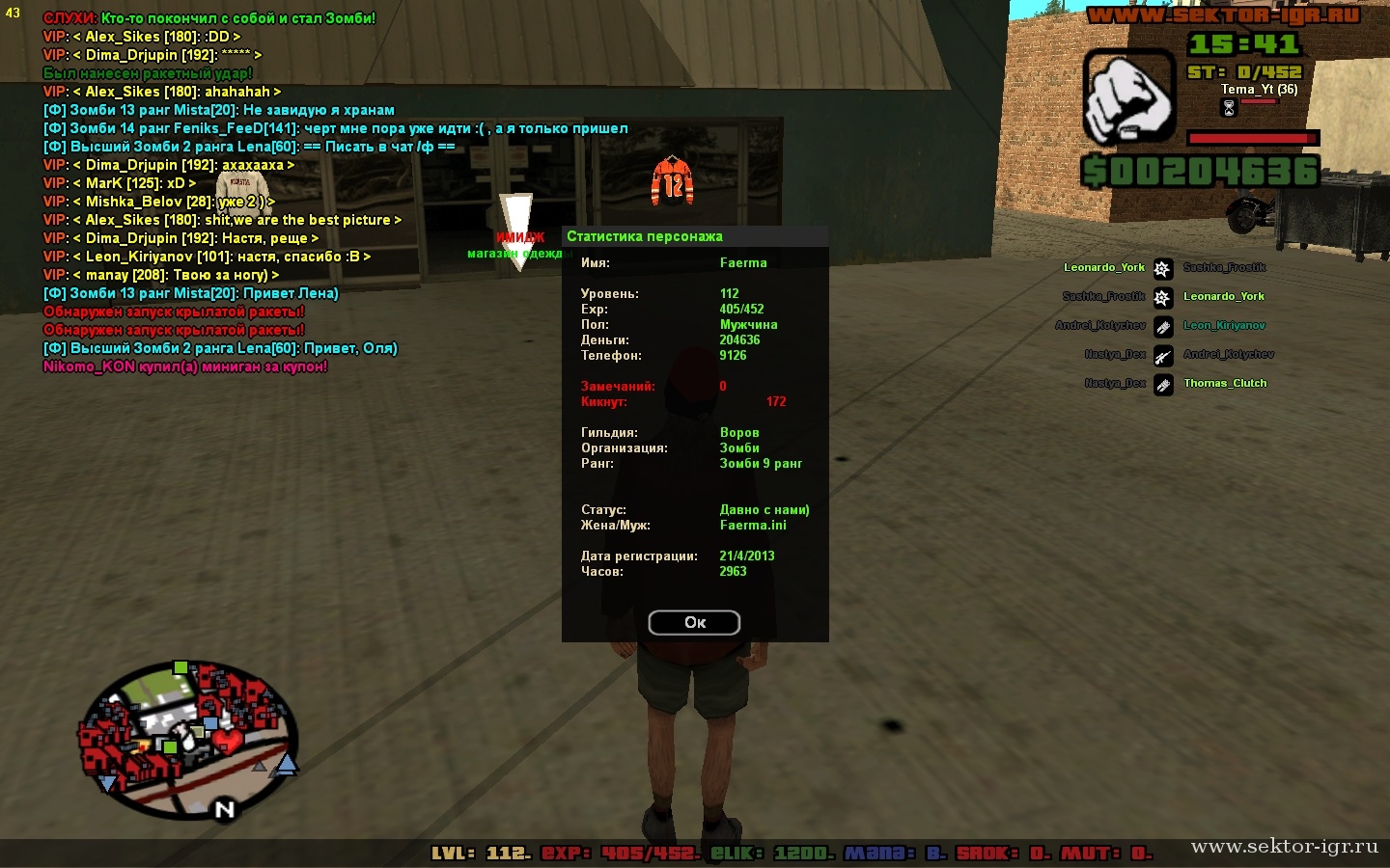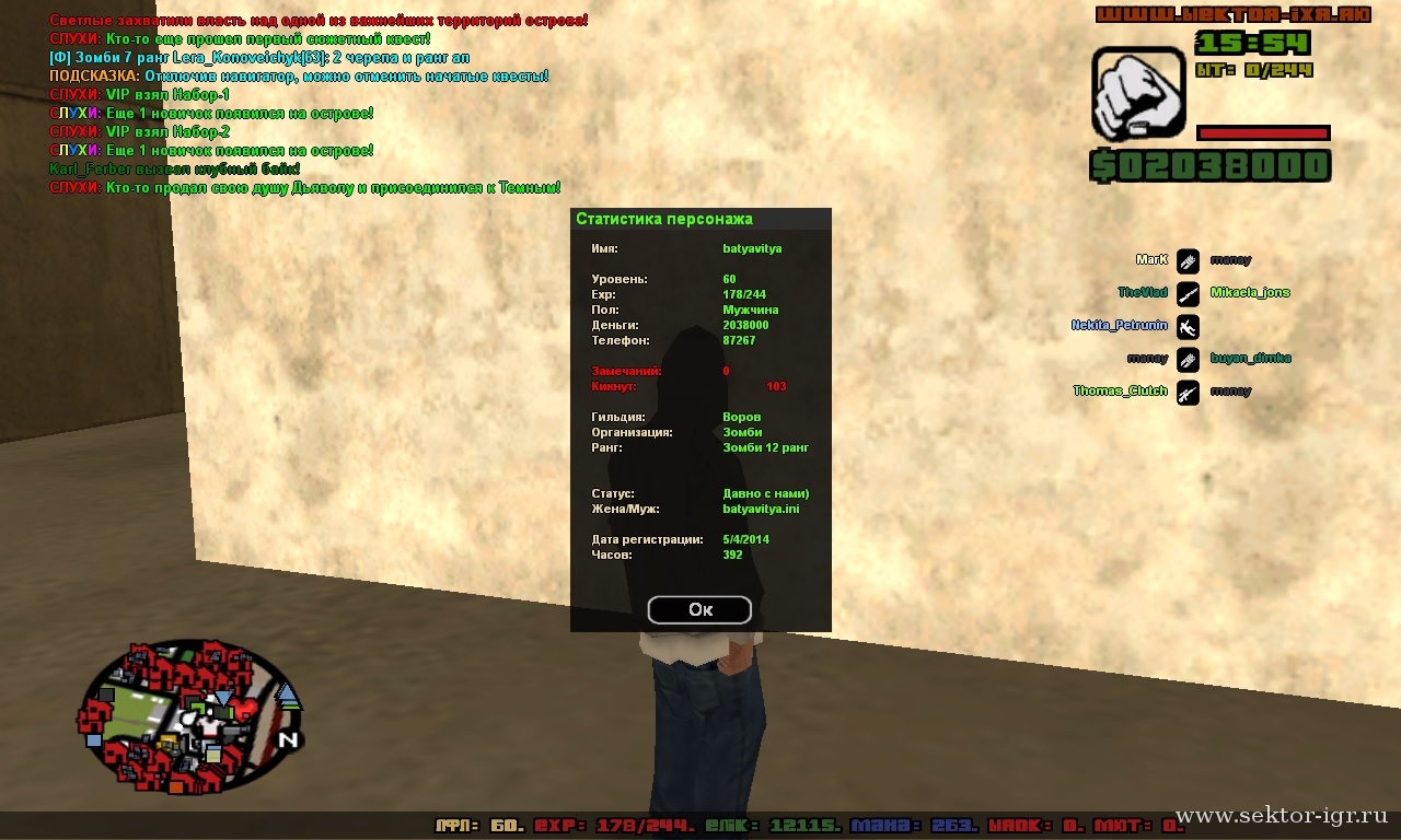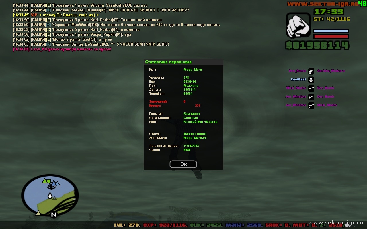 ФРАКЦИЯ: ТЕМНЫЕ (Высший Демон 1 ранга) ГИЛЬДИЯ: Вампиры :3 VIP: 8lvl УРОВЕНЬ: 25+ Допы: Turismo,bullet,nrg-500,blista,вертолёт) Оружия при себе: Riffle,minigun