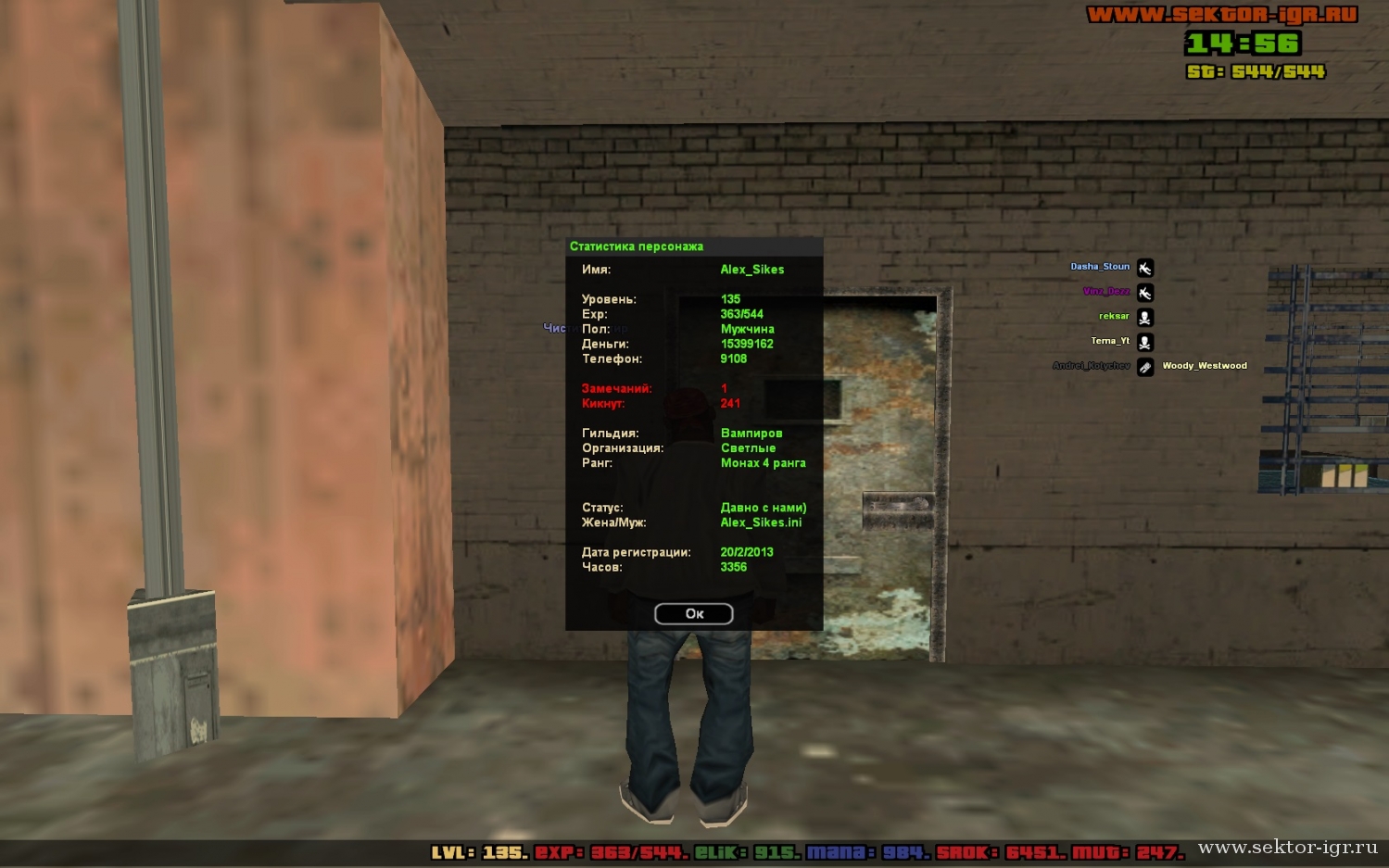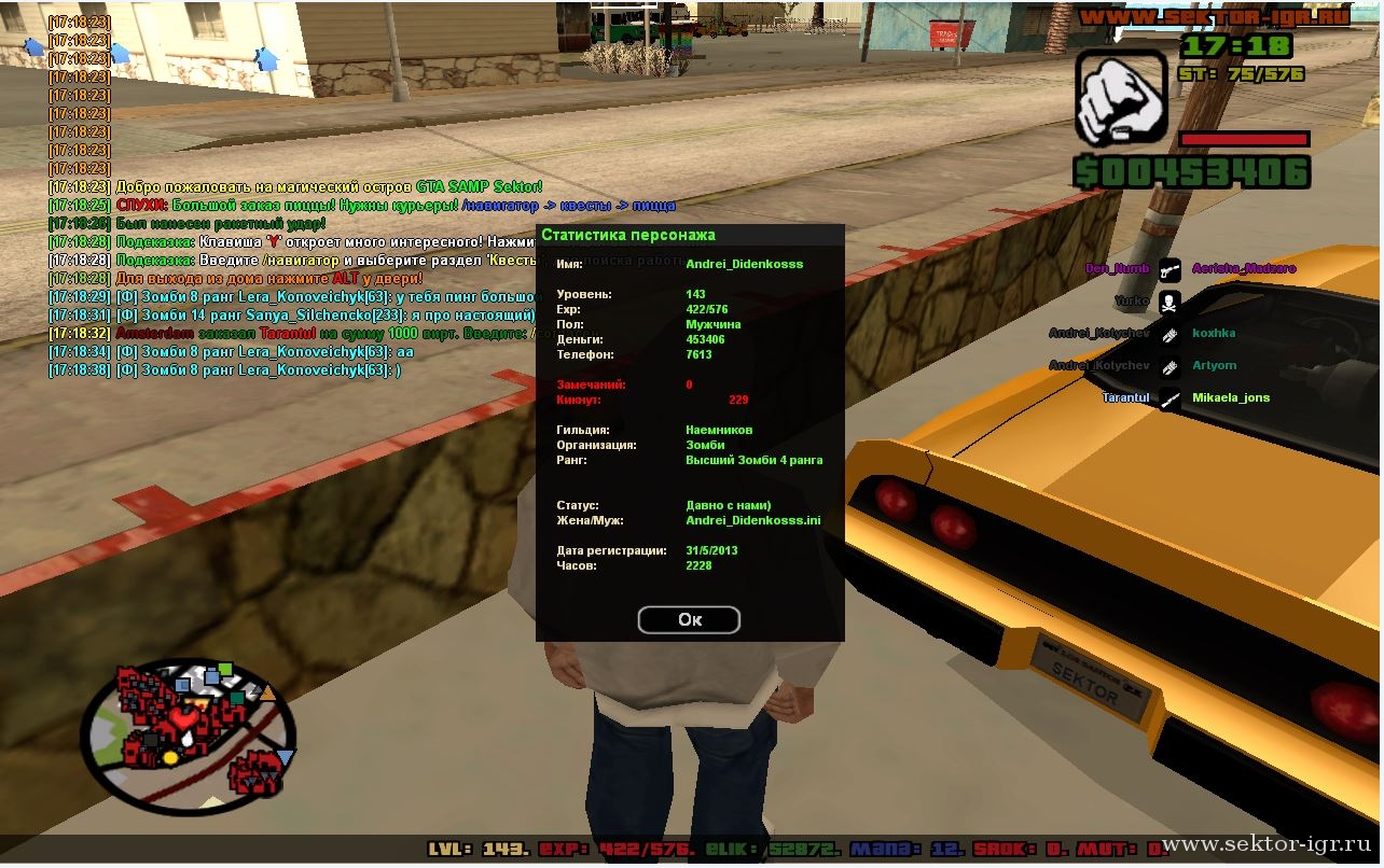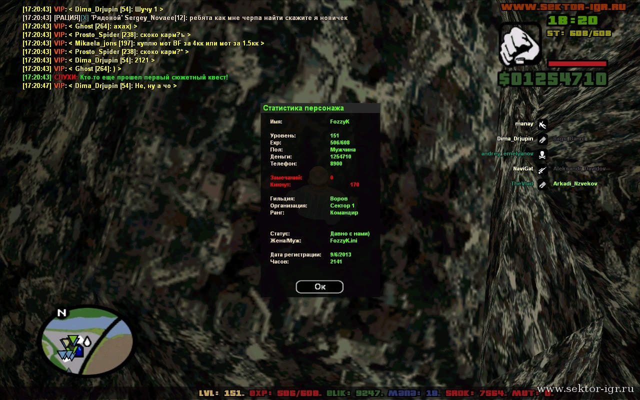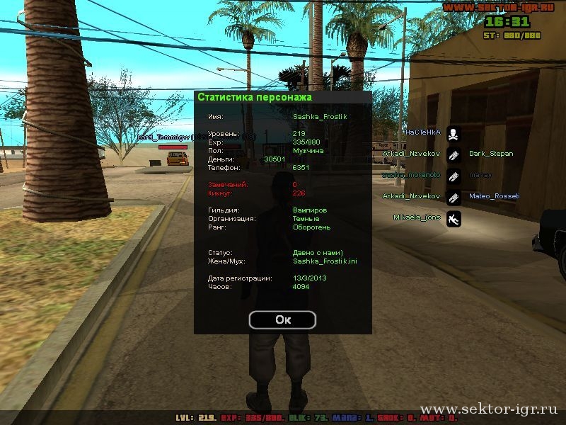 ФРАКЦИЯ: ТЕМНЫЕ (Высший Демон 1 ранга) ГИЛЬДИЯ: Вампиры :3 VIP: 8lvl УРОВЕНЬ: 25+ Допы: Turismo,bullet,nrg-500,blista,вертолёт) Оружия при себе: Riffle,minigun