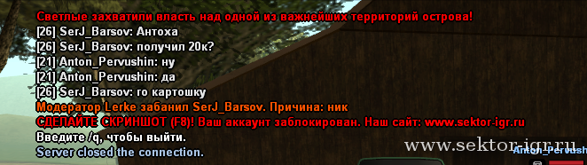 | Serj_Barsov Зарегистрировались с другом, играем,успел пройти 1 квест. И вот после него бан за ник. Я не знал что у Администратора ник "Барс" и на прошлом сервере с этим игра "Serj_Barsov" могу в лс скинуть скриншоты с того сервера. Как я понял. Вы подумали что я кошу под администратора сервера?- Готов заменить ник Перезалил скрин