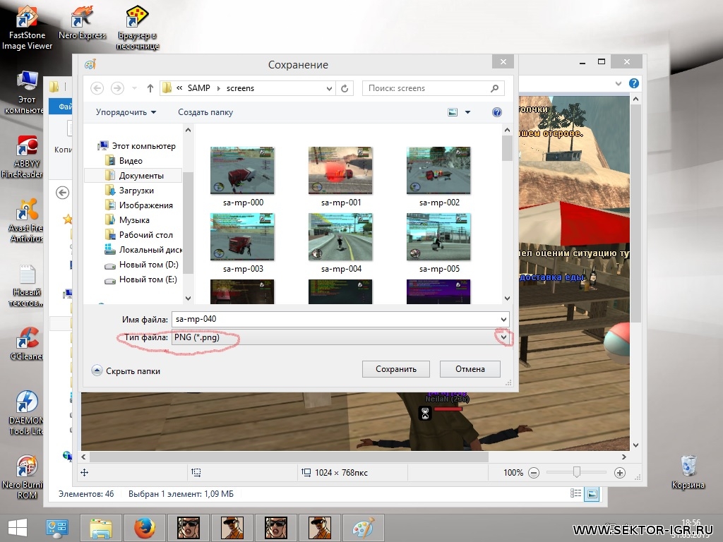 | Надя,зайди в пеинт. Там в левом верхнем углу есть кнопка "Файл", Нажми на нее и выбери пункт "Открыть", Затем Выбери свой скрин который находиться в документах "GTA SA user files"->"SAMP"->Screens, Затем когда откроется, нажми еще раз "Файл" там выбери "Сохранить как", Появиться окно,в котором нужно указать место сохранения,название и формат, Под строкой где нужно писать название,есть пункт"Тип Файла", Там выбери JPEG.вот Все,теперь можешь выкладывать скрин на сайт.