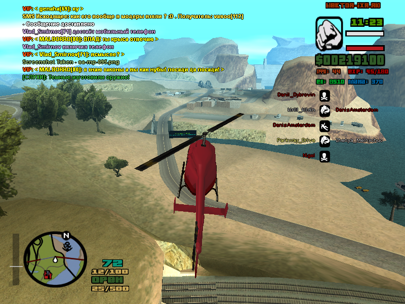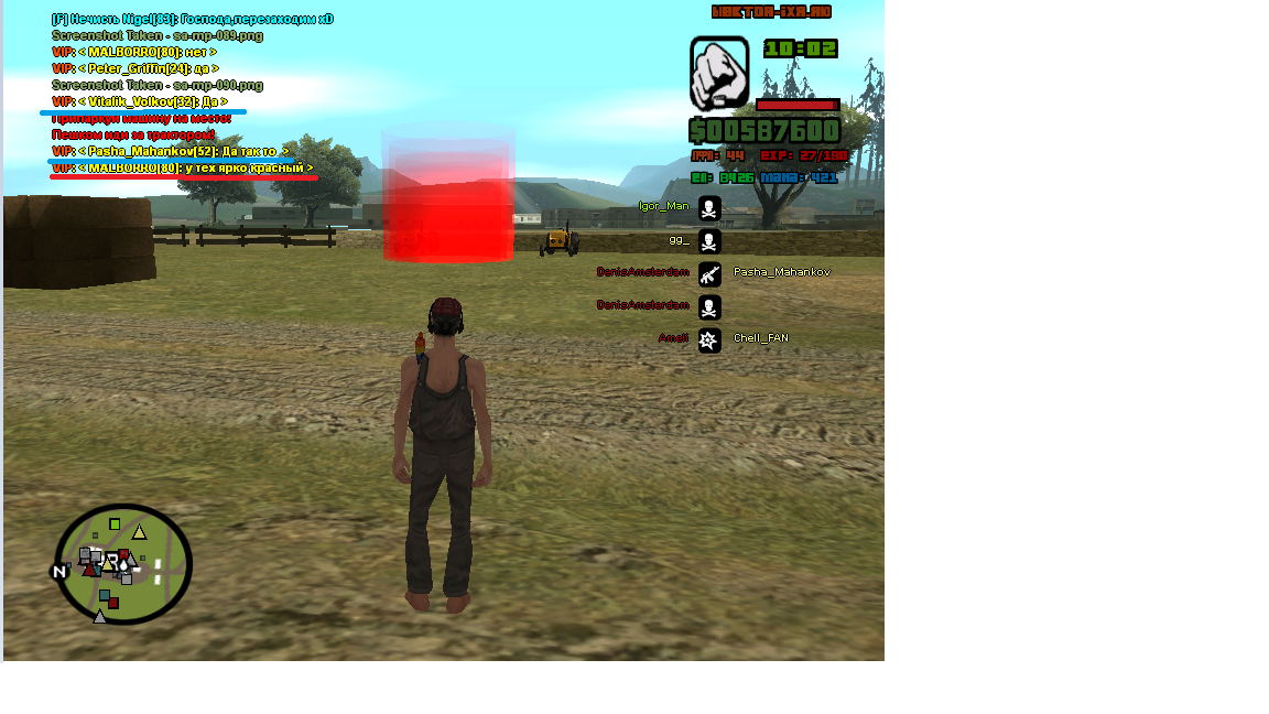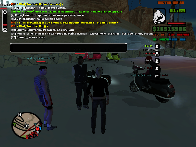 | Проезжая мимо оружейного магазина увидила как оттуда вышел Ronin с оружием и начал по нам палить. Я остановилась чтоб разобраться, и в это время он сел на мой байк пассажиром. Храны которые были со мной открыли по нему ответный огонь, но урона игроку не было. Я приказала хранам прекратить стрельбу, и провела проверку метеором. Убедившись что он не ГМ мы уехали, оставив его живым. Дальше в процессе слежки я установила, что Ronin напару с Reks ищут меня по всему острову на верте по всем квестам. При их общении Ronin неоднократно говорил что хочет найти меня и убить Тогда я решила найти его сама и объяснить что такое ДМ и чем это может для него обернуться. В результате общения он постоянно хамил, грубил и не хотел ничего слушать. После того как он начал угрожать мне в реале мной было принято решение изолировать игрока, посадив в чит-тюрьму до прихода администратора. После этого он продолжал грубить и угрожать серверу, за что получил бан чата от Белатрикс.