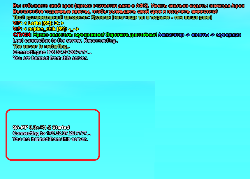 | Ник SergeyRU ...Алексей а меня за что забанили по IP я был в тюрьме утром обнаружил что забанен...Pacman соответственно тоже забанен...