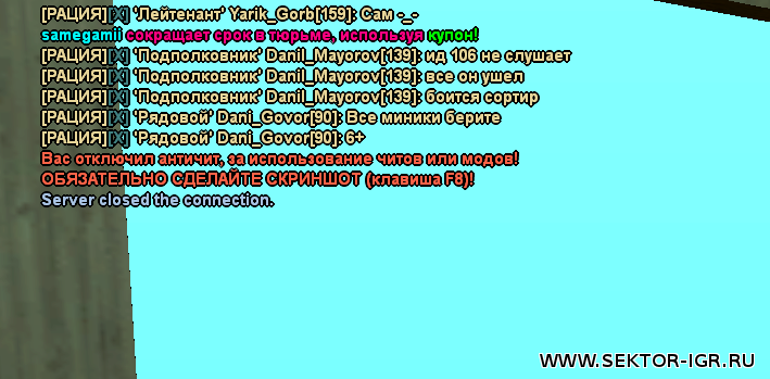 | Извиняюсь, закинул 2 скриншота, вот второй скриншот, на нем видно, что меня кикнуло.