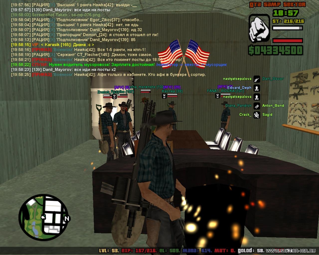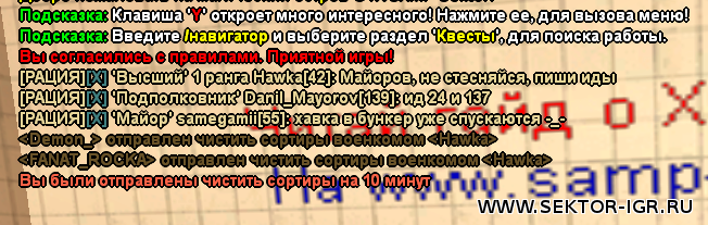 | Извиняюсь за обрезанные скриншоты, сжать не знаю как! Начну свой монолог! Я и еще пару людей, стояли себе в кабинете, некоторые AFK, некоторые нет, после этого в кабинет заходит Danil_Mayorov и начинает нас скринить, угрожать и говорит Хавке, что бы находимся в кабинете, но не в "AFK". После чего, Военком Hawka начинает говорить, чтобы всё вернулись на посты, но т.к. я не могу свернуть игру где-то кроме кабинета, потому что кикает за AFK на секторе.Меня кикает т.к. я вышел и зашел случайно в кабинет(видно на 1 из скриншотов) я перезахожу в игру, захожу в кабинет, Майоров пишет Военкому, что я и еще 2-3 людей не стоят в AFK и он просто их садит в сортир, при том, что те люди стояли и вправду в AFK. Прошу рассмотреть данную жалобу по-поводу Военкомства Хавки, т.к. в правила не указано, что в кабинете, мы обязаны стоять в AFK.и так Hawka посадил 3-4 людей без причины..