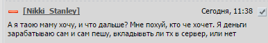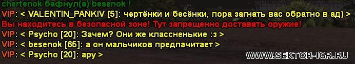 | [Nikki_Stanley], ну так ты веди себя адекватно. Это игра - не надо принимать всё близко к сердцу. Оскорбили - проигнорь, а не лезь в срач. [Nikki_Stanley], как ты говоришь, ты - погранец, а у них довольно хорошая выдержка, но по тебе этого не скажешь. Кто границу будет охранять, если ты почти весь день в онлайне? Я не хочу спорить с тобой, т.к. понимаю, что смысла нет. Но мб когда-нибудь, ты исправишься. PS: зачем изучать психологию, если всё это открывается на примерах реальной жизни?