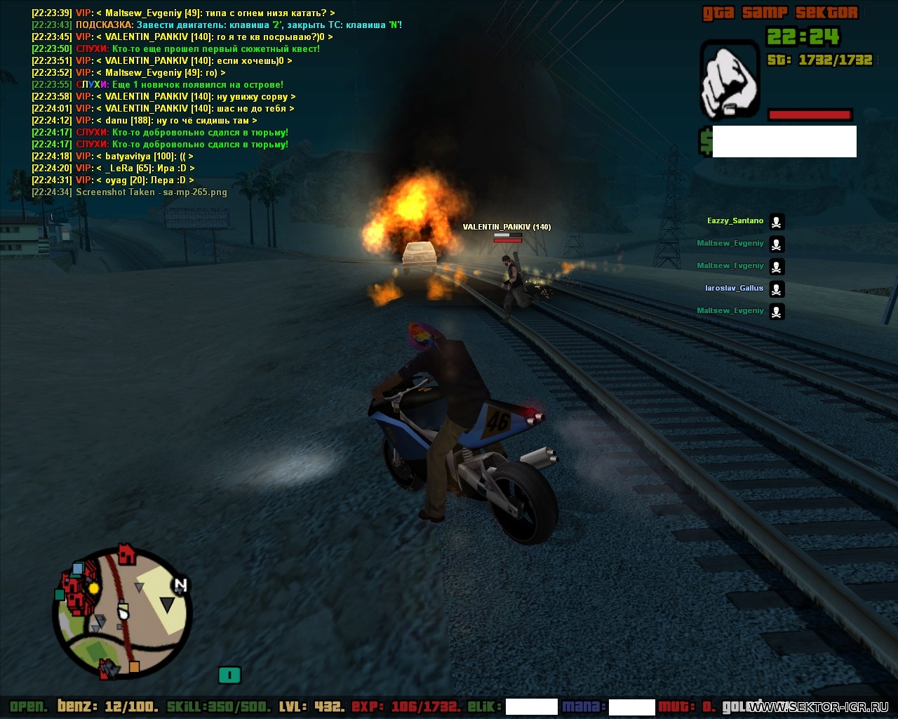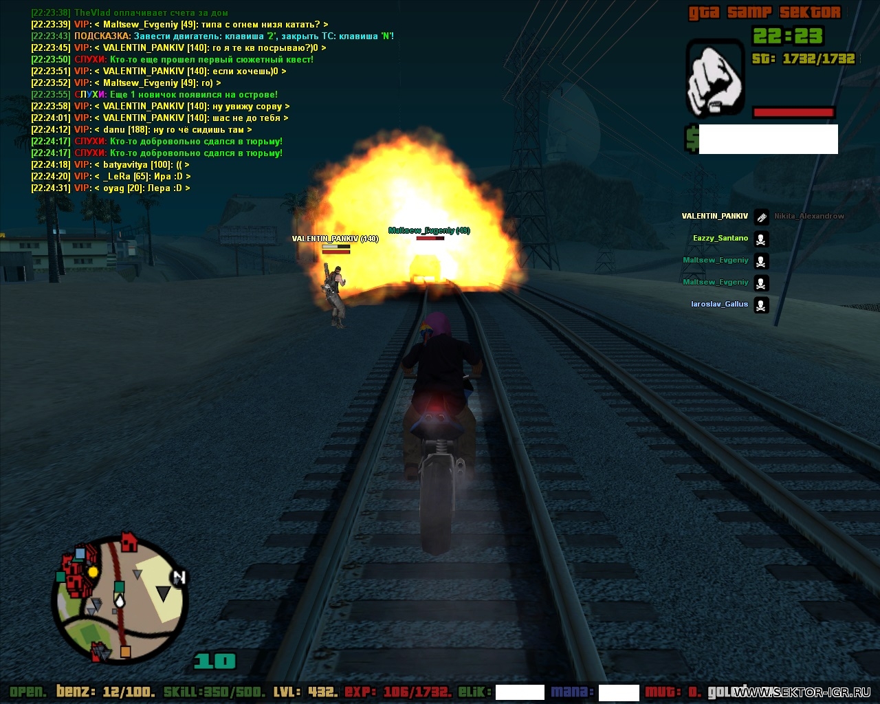 | Цитата [V][A][L][I][K] (  ) Сам первый приехал на терру, пытался слить меня огнём, но я тебя слил опередил Взял огонь,нельзя что ли?просто подьехал посмотреть.И ты огнем.Второй раз на твоих же скринах - порча от тебя и огонь.А остальные мои скрины и Влада - 3 и 4 раз огнем дм с твоей стороны.То что я слил тебя - наказала система звездой,скрин могу показать где с ней бегаю.Цитата Hикки (  ) Мальцев_Евгений, Эти скрины - типичная подстава. Вы спецом ехали к вале, чтобы помешать войне.Что же делает хран, на фракционном т\с на рельсах? выжидает момент для подставы, а он лишь оборонялся. Но вы же его слили потом. Помеха войне. А вот собственно - то, что ты мне писал вчера и ливнул багоюзом(ХП было полное) А здесь я распишу как было.Я спускался в шахту,ты поднимался на нрг и врезался в меня,после чего слетел с мота и умер.Это вышло случайно,никакого багоюза и прочего нету.А то что в чате написано - я тебе пояснил что не надо лазить около меня.До того как ты умер ты назойливо ездил около меня как муха,что бесило.Про оборону и помеху - тм рядом не было когда я его ливнул и ничем не мешал ему терру захватывать.