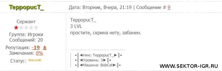 •║◄Ник: TeppopucT_►║• •║◄Уровень: 3►║• •║◄Машина: BobCat►║•