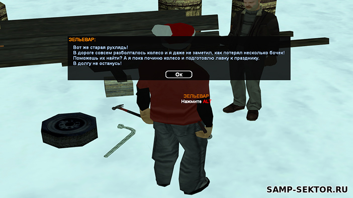 - В первом квесте Прораб расскажет, что они готовят площадь к Новому году. Рабочих рук не хватает, а необходимо срочно забрать доставку с сухогруза. Он предложит вам свою машину и попросит вас выполнить это задание.