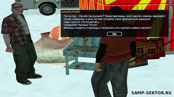 - Как и на других ивентах этого места, NPC будет двигать руками при разговоре, а весь диалог будет не в чате, а в отдельном меню! Вы узнаете, что мангал совсем проржавел и не годится для приготовления фирменного шашлыка.