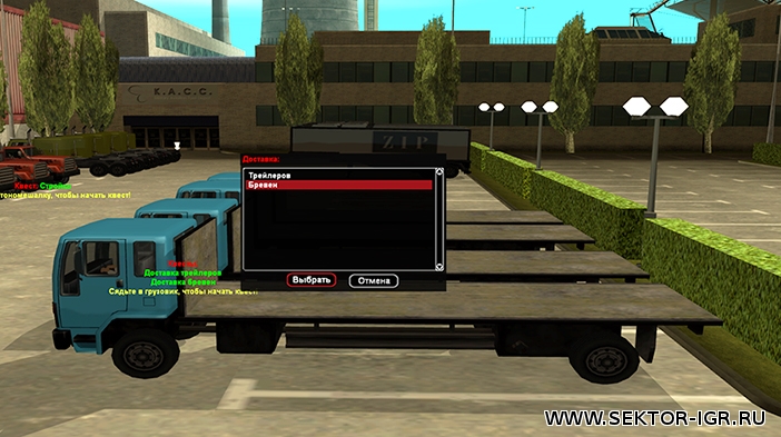 - Начать квест можно на заводе. Садимся в пустой грузовик, на котором обычно возим трейлеры. Тут теперь меню с двумя пунктами, на выбор - доставить трейлеры или бревна!