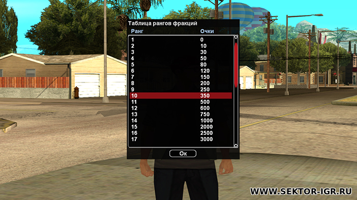 - Добавлена таблица рангов для фракций! Посмотреть ее вы сможете в меню справки (Y - Справка). Когда вы смотрите это меню, то в чате будет появляться небольшая подсказка о том, где и как можно получить очки ранга.