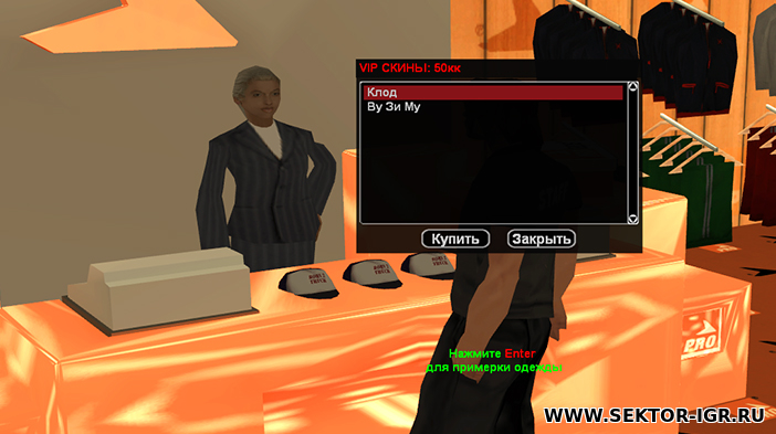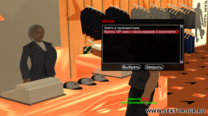 - Для покупки VIP скина отправляйтесь в магазин Имидж и подойдите к продавцу. Нажав на клавишу, перед вами откроется меню: отправиться в примерочную (обычная одежда) или купить скины по акции (VIP).