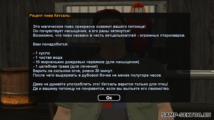 - Для квеста "Любимое пиво" весьма низкие условия - нужен попугай от 30 уровня и навык дрессировки. Однако, на вашего питомца могут напасть другие игроки и сорвать квест.