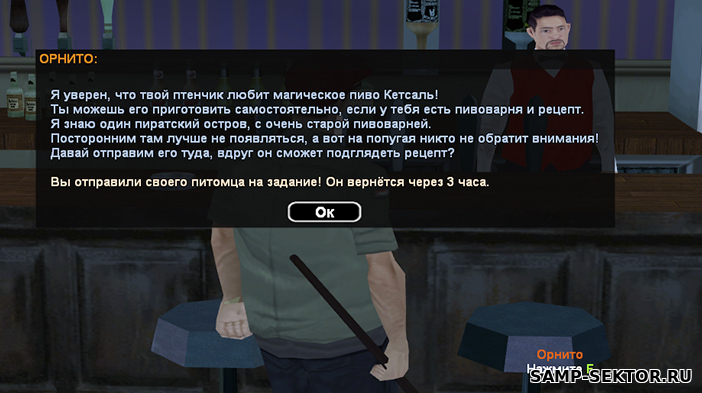- Выберите задание "Любимое пиво", Орнито расскажет, что знает где находится пиратский остров с очень старой пивоварней. Самому туда плыть крайне опасно, а вот на попугая могут не обратить внимания!