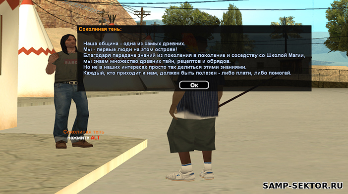 - Соколиная тень расскажет, что их поселение очень старое и они одни из первых людей, кто появился на острове. Древность их рода, бережная передача знаний из поколение в поколение, а так же соседство со Школой Магии способствовало тому, что люди в этом месте знают много старинных секретов и рецептов. Однако, просто так делиться чем-то они не хотят и индеец скажет прямо - если хочешь что-то от них, то либо плати, либо помогай.